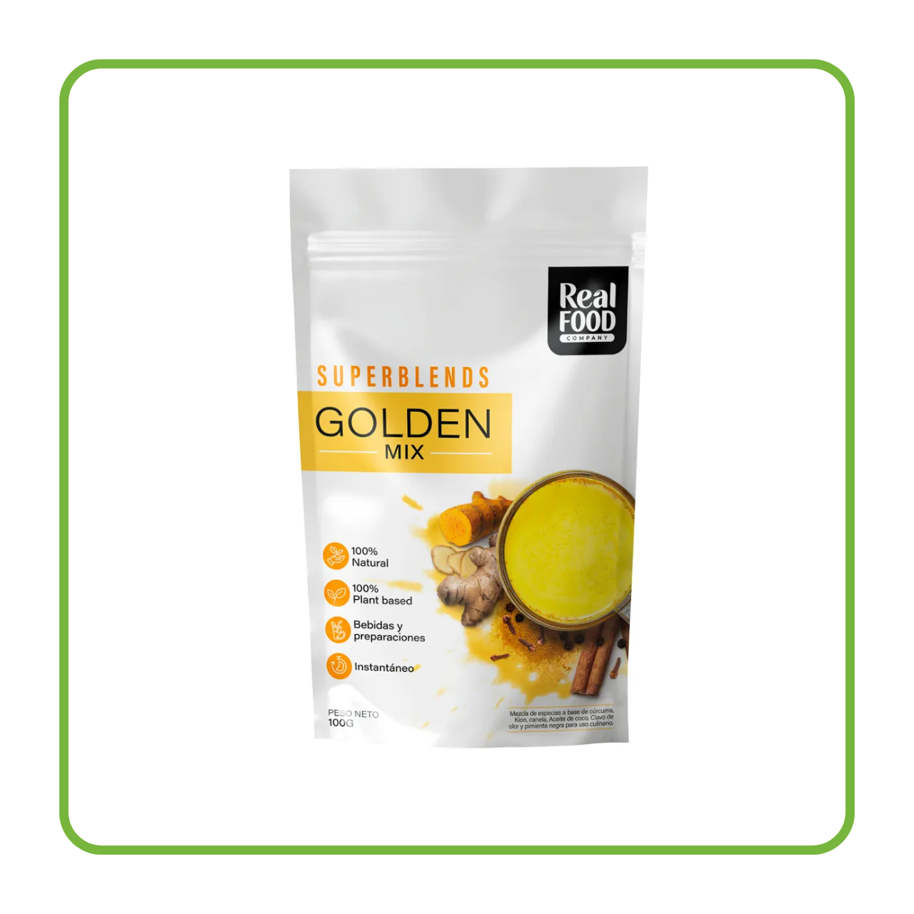 El «Golden Milk 100 Gr de Real Food» Mezcla instantánea en polvo a base de cúrcuma, kion , canela, aceite de coco, clavo de olor y pimienta negra. Ideal para preparar una bebida de golden milk con acción desinflamante, antioxidante y digestiva, para acompañar las medias tarde o cualquier tiempo de comida. Presentación en polvo.